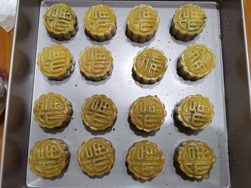 花生40克,黑白芝麻各40克,杏仁40克,核桃40克,南瓜籽葡萄干各40克,玉米油冰糖粉30克,水70克,中筋粉24克,糯米粉65克,月饼皮:中筋面粉250克,转化糖浆175克,枧水5克,花生油62克,蛋黄水(刷饼皮面用)一个蛋黄加四分之一蛋白加15克牛奶