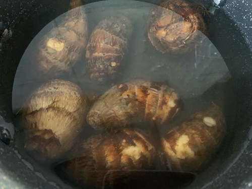 做法分解2:半小时后将芋艿的泥水洗净放锅里煮半小时以上,煮至筷子能戳穿