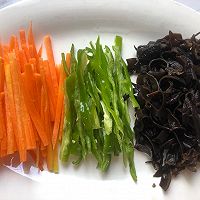 料酒1勺,生抽1勺,蚝油1勺,醋1勺,豆瓣酱1勺,糖1小勺,蒜2瓣,淀粉1勺,猪肉200克左右,胡萝卜1根,木耳1小把,青辣椒1个