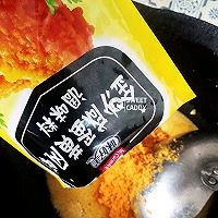 做法分解7:另起锅加入20克食用油,炒勺一半的量,放入一袋金沙咸蛋黄风味调味料。